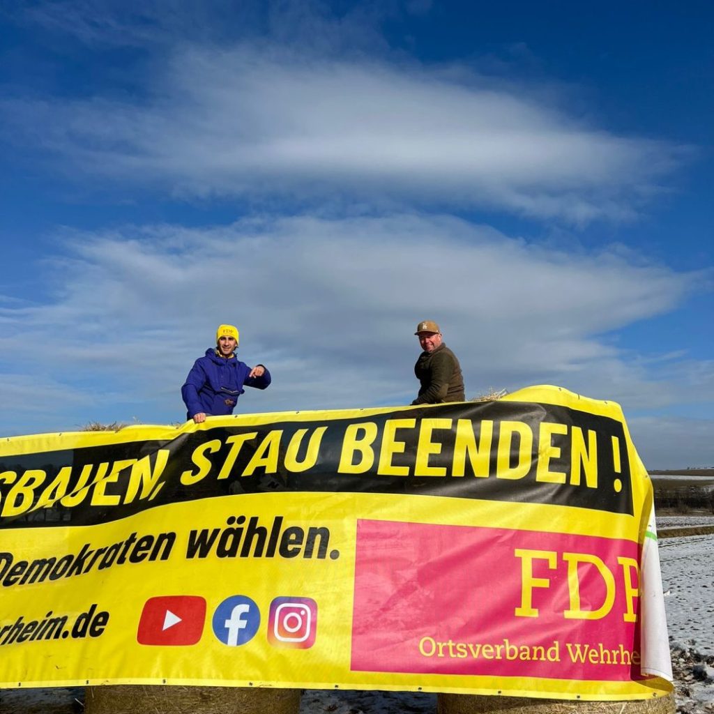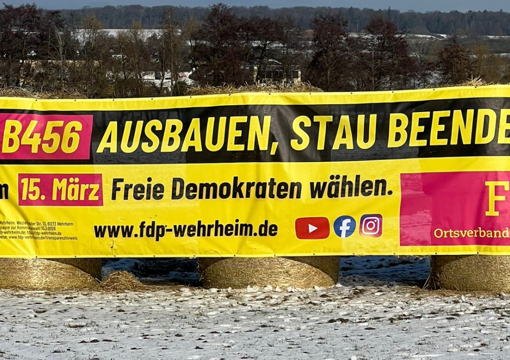 Zur Kommunalwahl am 15. März ist die FDP Wehrheim besonders sichtbar unterwegs. Wie schon im erfolgreichen Wahlkampf 2021, an dessen Ende starke 18,5% der Stimmen standen, machen wir mit unseren besonderen Bannern auch dieses Mal wieder auf zentrale politische Inhalte unseres Programms aufmerksam, Themen die Wehrheim bewegen.