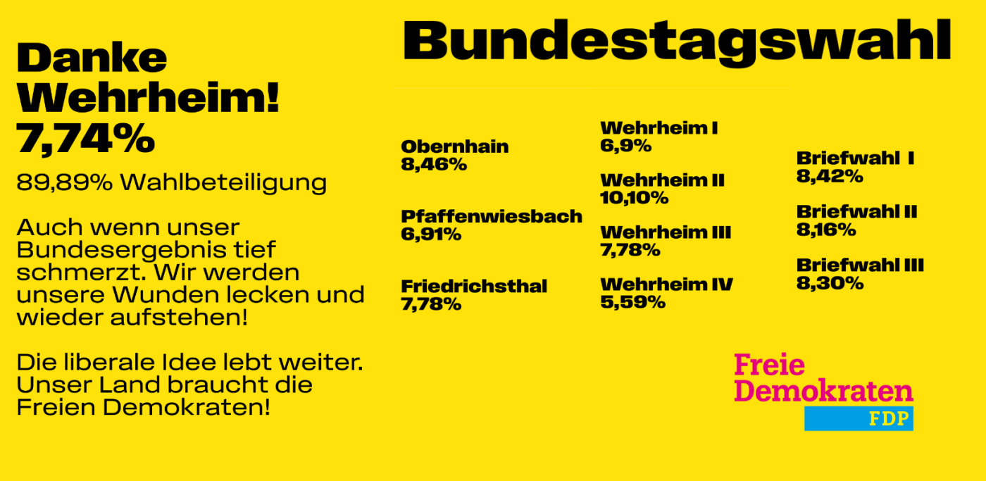 Der FDP-Ortsverband Wehrheim bedankt sich bei allen Wählerinnen und Wählern für ihre Stimme. Ebenso gilt der Dank allen Aktiven und Unterstützern im Wahlkampf der vergangenen Wochen.