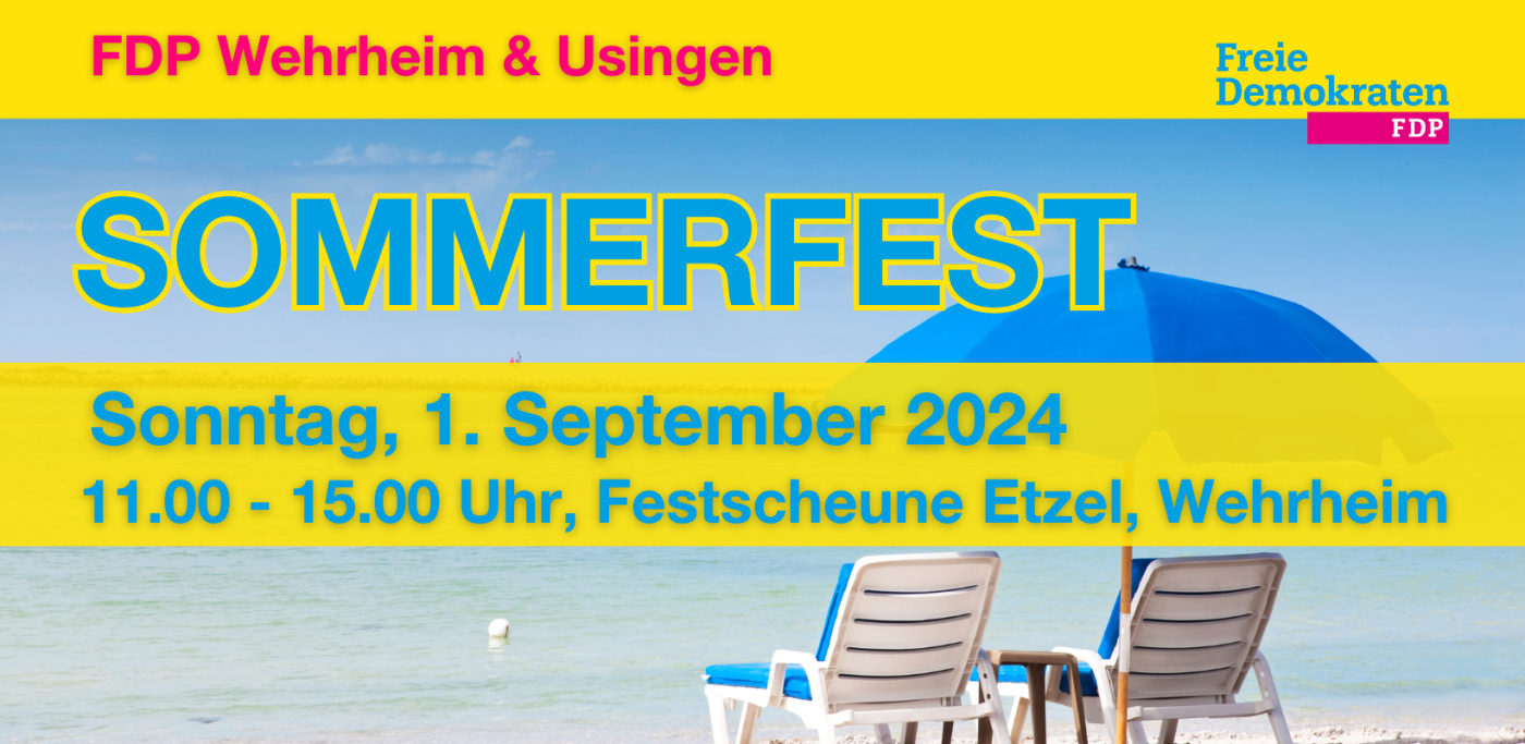 Wehrheim. Die FDP-Ortsverbände Wehrheim und Usingen laden zum gemeinsamen Sommerfest 2024 ein. Bei Speisen und Getränken wird gefeiert am Sonntag, 1. September 2024, von 11 bis 15 Uhr im Hof und in der Festscheune Etzel in Wehrheim (Pfaffenwiesbacher Str. 6).