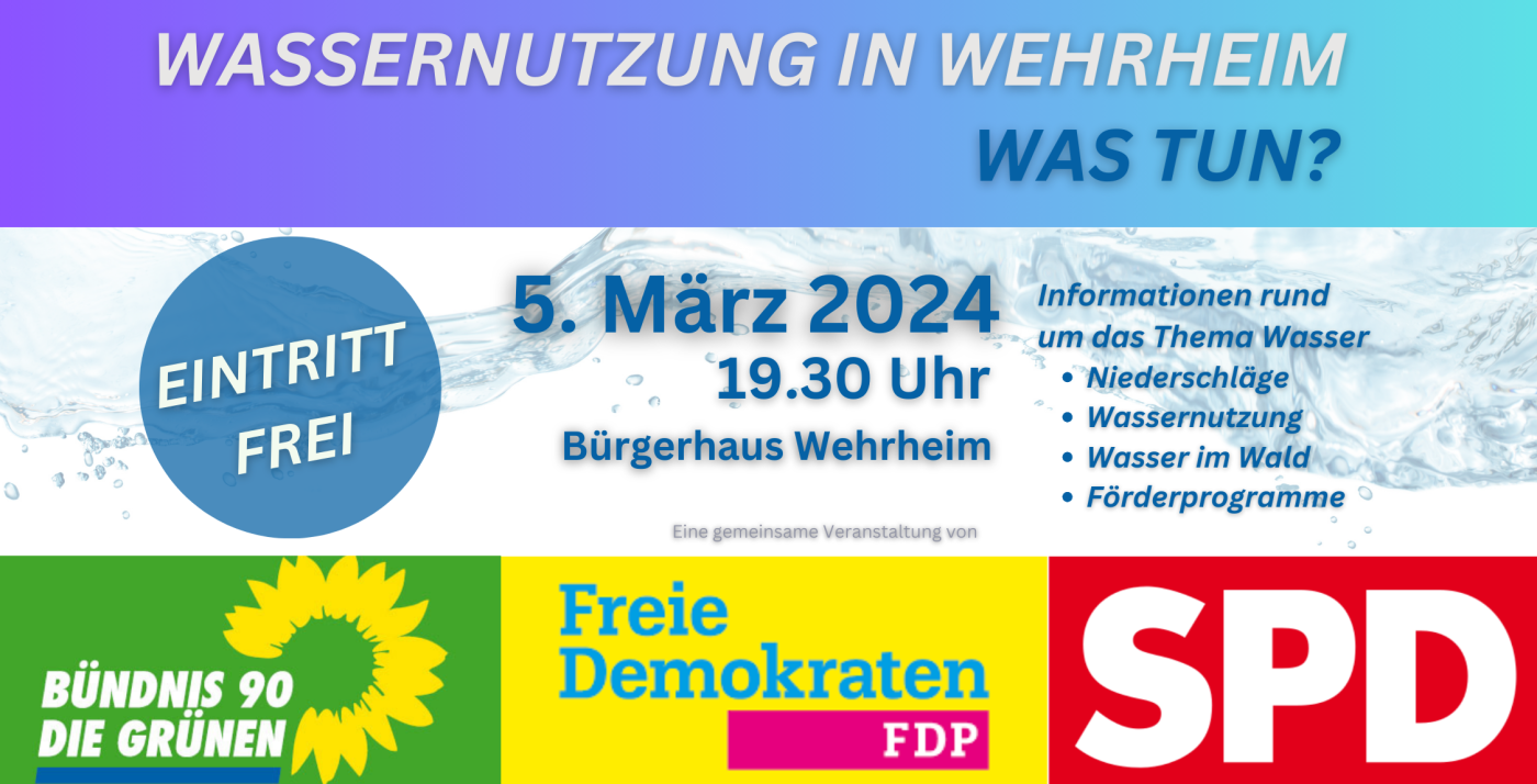 Wasserknappheit, Starkregenereignisse – Was ist zu tun? Wehrheim. Grüne, FDP und SPD setzen ihre gemeinsame Wehrheimer Informationsreihe fort. Nach dem Thema Energie und Photovoltaiknutzung befassen ...